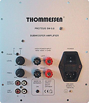 Two gold-plated cinch sockets are offered for the left and right outputs of a preamplifier. A second set of cinch sockets works as a signal splitter for the satellite amplifier. By connecting the Proteus SW0.8 directly to the loudspeaker outputs, it is also possible to employ an integrated amplifier that does not offer separate preamplifier outputs. The amplifier's output power should not exceed 2 x 100 W on 4