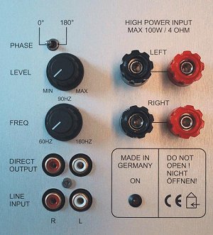 The optional external level control allows setting the subwoofer level directly from the front of the subwoofer's enclosure. |