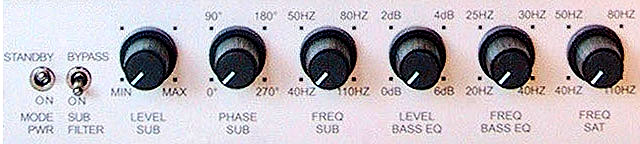 - subwoofer: 3rd order Butterworth, adjustable 40-110Hz - satellite: 2nd order Butterworth, adjustable 40-110Hz - subsonic: 3rd order Butterworth 12 Hz (all crossover points referenced to -6dB) - subwoofer phase control 0-270° - bass boost max. +6dB, center frequency adjustable 20-40Hz |